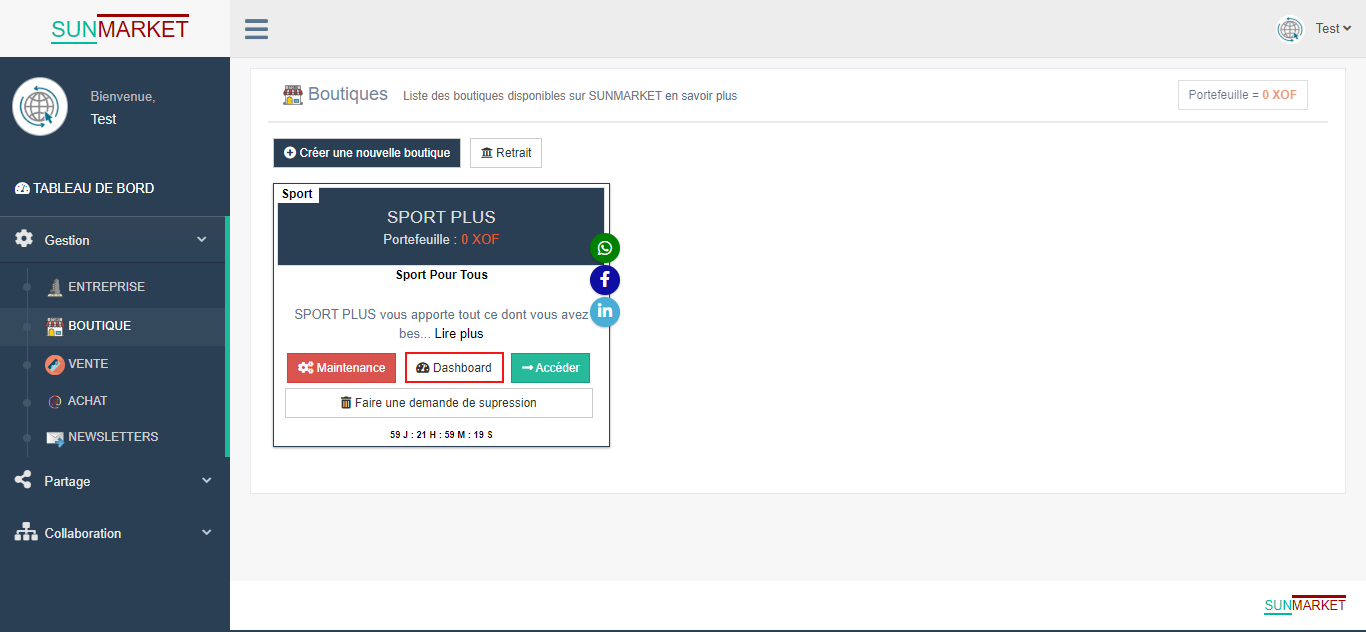Cliquer sur le bouton dashboard de votre boutique pour débuter la configuration.